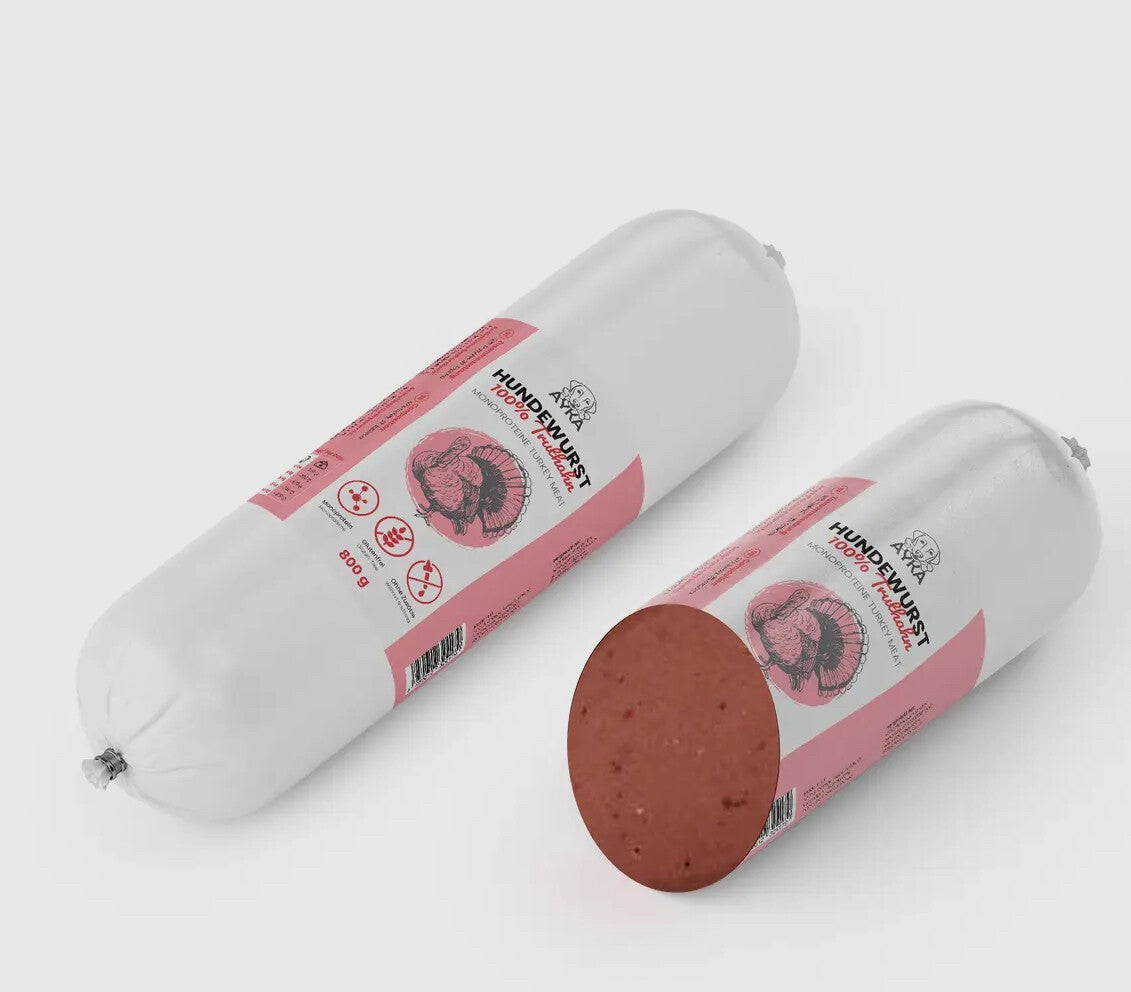 Ayka hondenworst kalkoen Deze heerlijke, snijbestendige vleesworsten bestaan uit 99,5% spiervlees van de respectieve diersoorten. Perfect voor een hoofdmaaltijd of voor een kleine beloning tussendoor!