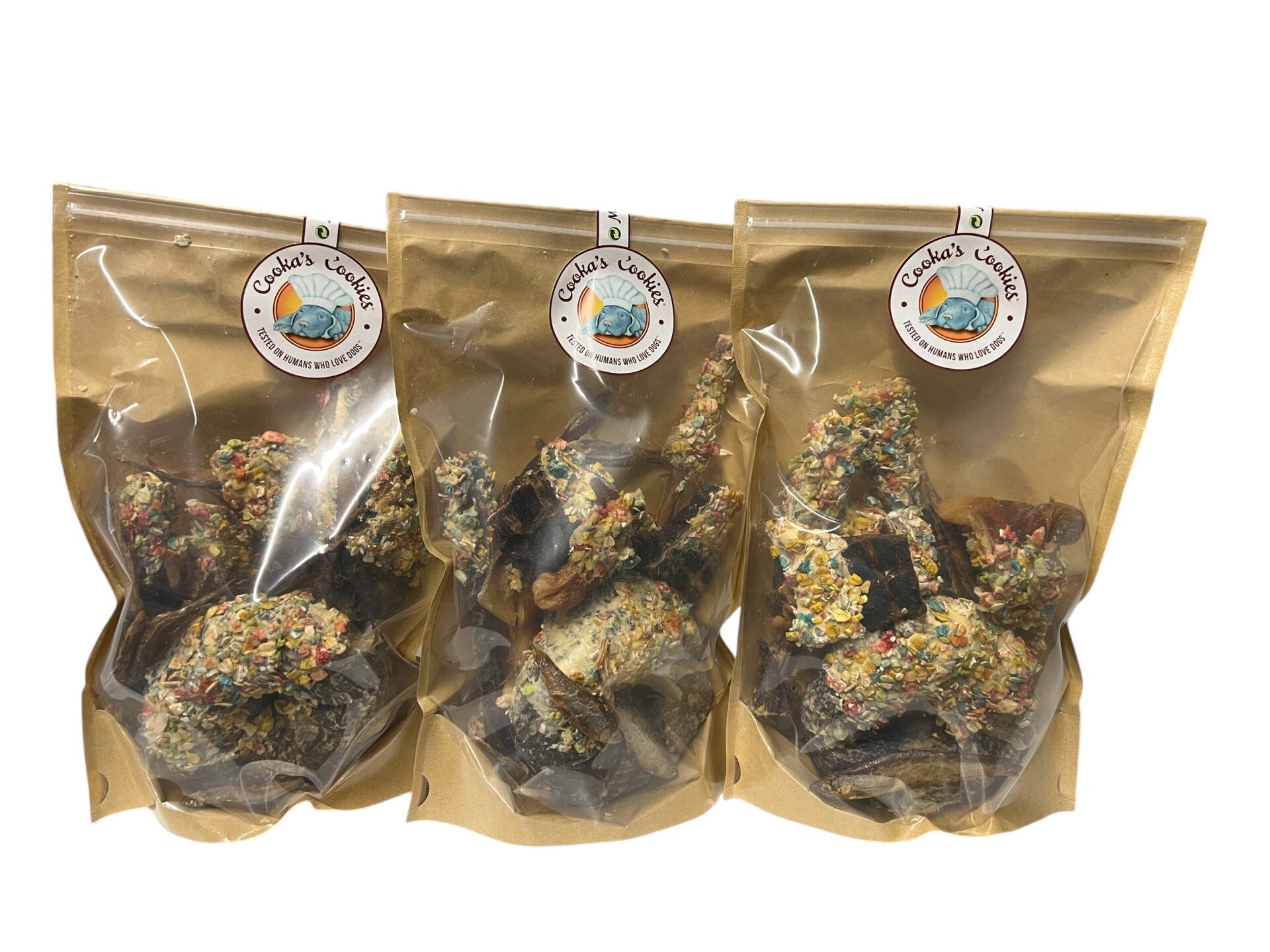 Mix van luchtgedroogd vlees en vissnoepjes .100% natuurlijk, Vlees- en vismix bestrooid met dogfetti, 1 donut met kabeljauw, Runderschors (pens), Pork Crackle (binnenoren), Kleine vis (omena), Kalkoenkrokantjes (kalkoenborsten), Rundvleesbrownies (lever)